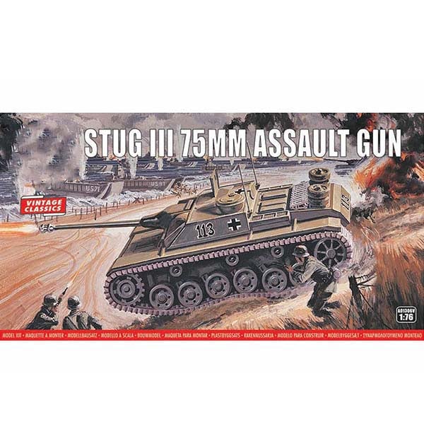 Enjoy the nostalgia of Airfix Vintage Classics with the Stug III 75mm Assault Gun! Featuring a length of 71mm, 79 pieces in each kit and spreues and decals, you can now bring the history and legacy of the Stug III home for your Airfix model range today! Mould Tools made in 1962, pack illustration by G.Schule, 1963.