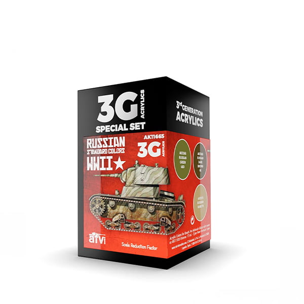 A special set of 3rd Generation acrylic paints including the three basic camouflage colors used for painting Soviet army vehicles during World War II.