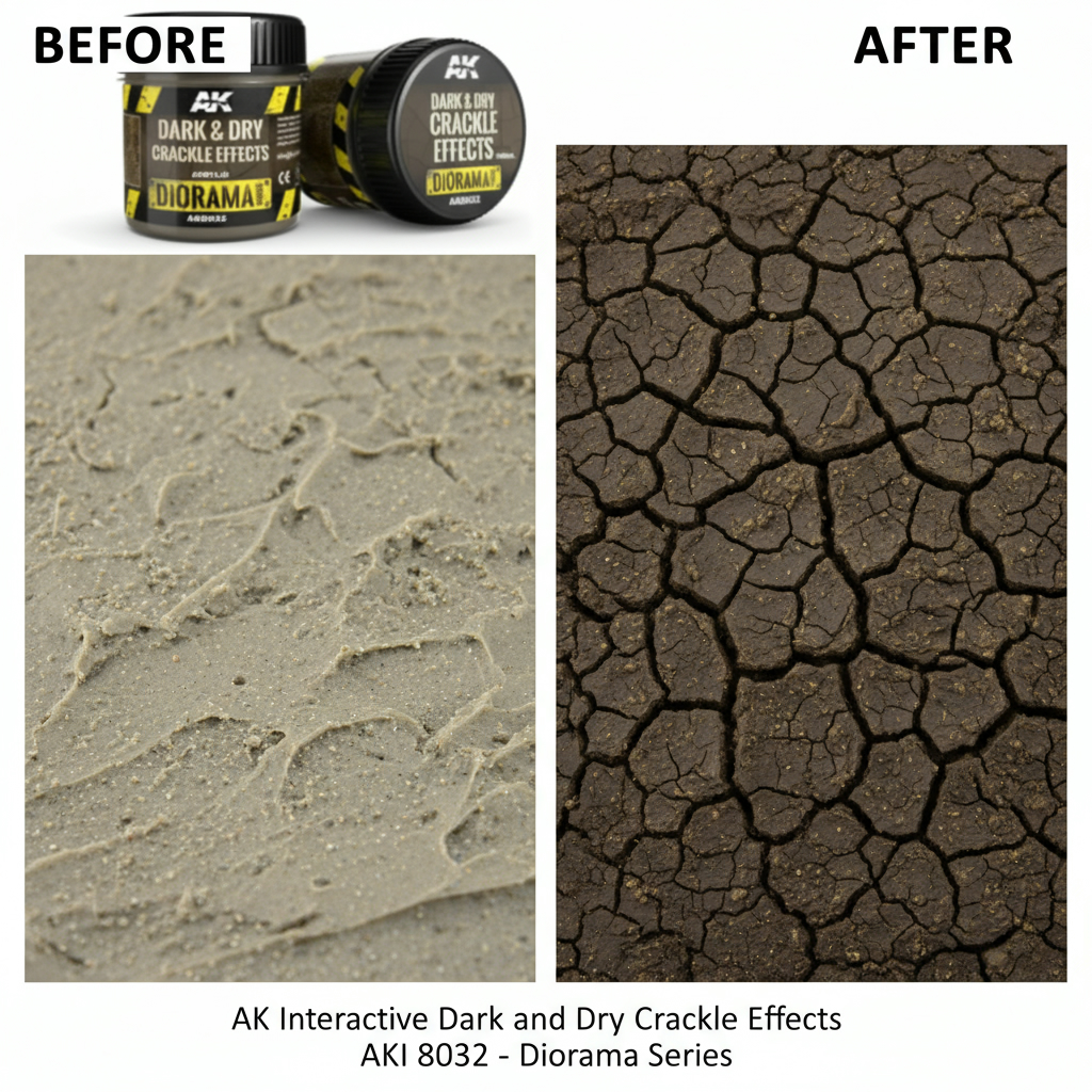 Dark and Dry Crackle Effects has been formulated for creating dark and crackled soil on the lower surfaces of vehicles, dioramas, and vignettes. This product has been composed for the creation of perfect scale correct crackle effects every time. Over an acrylic base, use a thin layer and let dry.