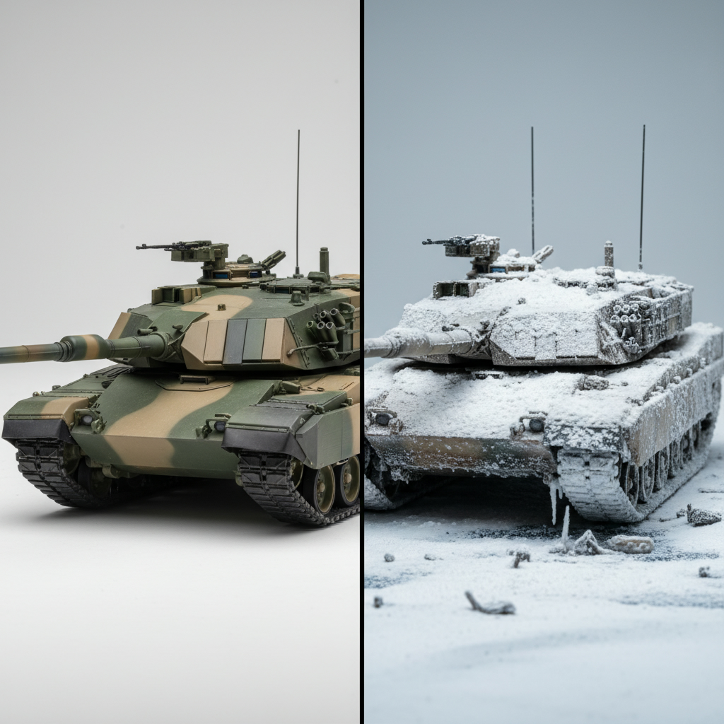 The color Snow White is intended for reproducing winter effects and for mixing with other tones to achieve lightened and desaturated shades. The faded paint applied in winter camouflage behaves similarly to the effects we can reproduce with this type of paint.