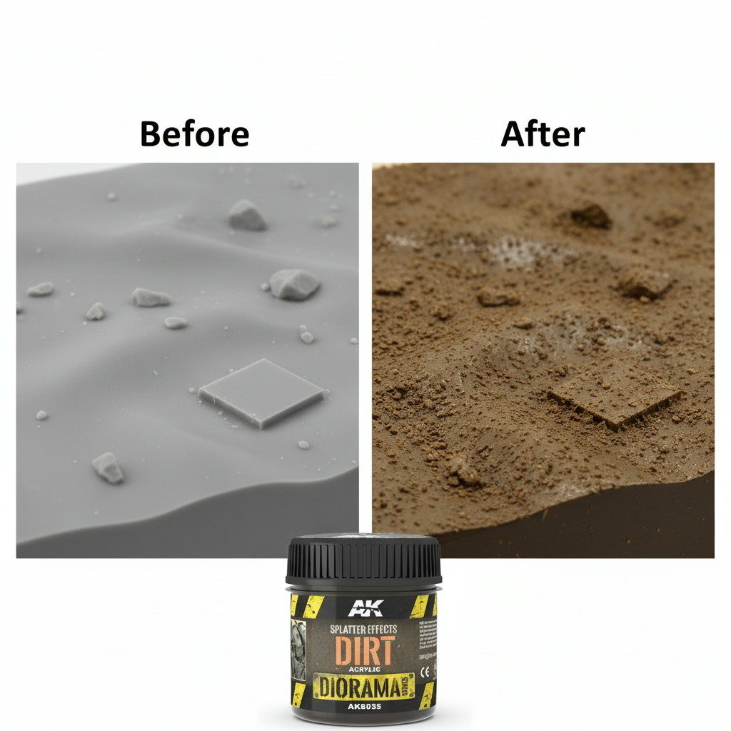 Dirt has been formulated for creating splatter effects and textures on vehicles, dioramas and vignettes. Accumulated Dirt is just the right consistency to apply in many areas and the lower parts; easily handled by brush, creating realistic textures of accumulated dirt. It can be reworked with a brush moistened in water, while it is wet.