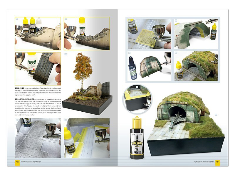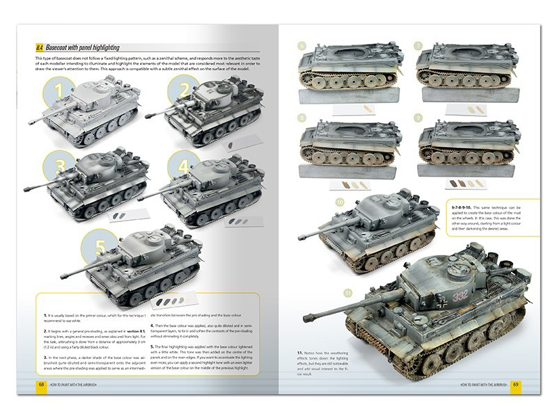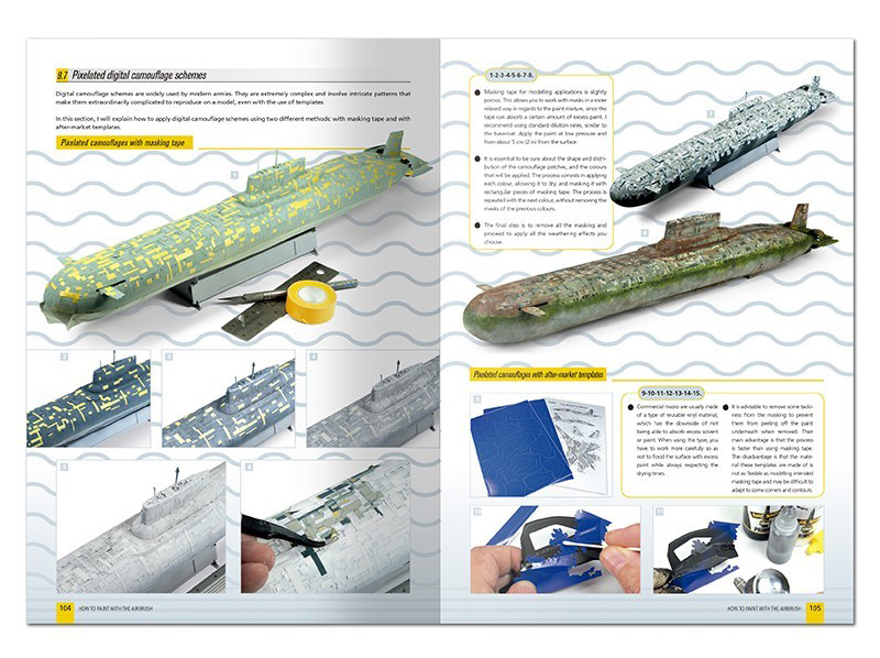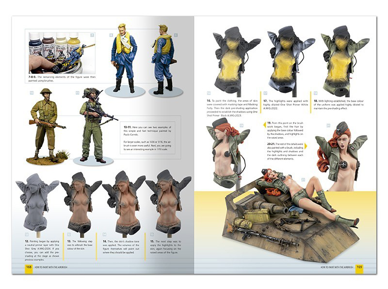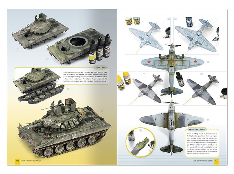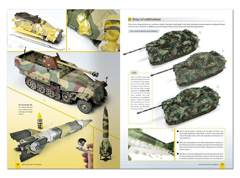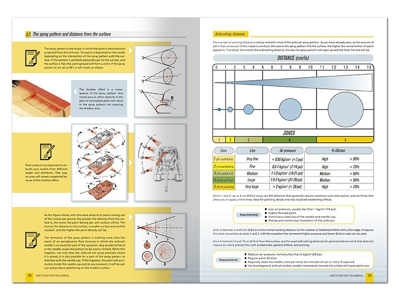 In the second part of the book, all the different applications and painting techniques that can be done with the airbrush are addressed, including pre-shading and base coats, all types of camouflage, lighting and shading, stencils, varnishes, transparent colors, aging and weathering, as well as the airbrush applications for painting dioramas and figures.