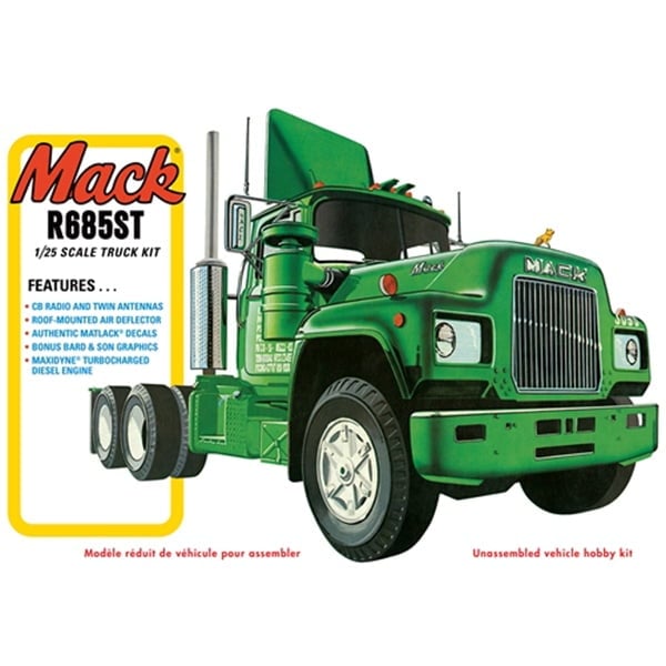 The Kats at AMT have listened to what truck modelers want to see again, and here’s a top selection – the Mack R685ST tractor! This super-detailed big rig has all the great parts truck modelers want, including the wheel options that have been left out of previous releases! It has been spruced up with expanded and improved decals, too! It features fantastic Retro Deluxe™ vintage packaging to boot. Get truckin’ with AMT!