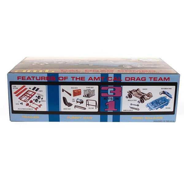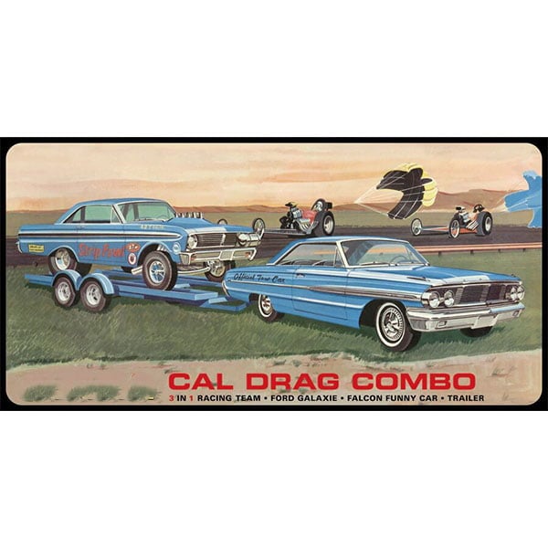 Value packed 3-kit combo set: AMT’s 1/25 scale Cal Drag Combo is available for the first time since the mid-1960s! It includes THREE complete model kits: 1964 Ford Galaxie Tow Car, 1965 Ford Falcon “Funny Car” and Flatbed Racing Trailer!
