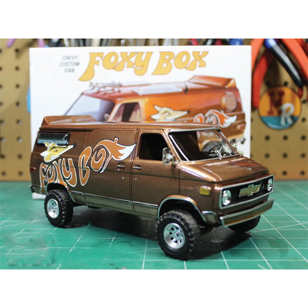 Loaded with vanner goodies: The Foxy Box is a classic custom van. Fully paintable, it features an EXPANDED, authentically detailed, water-slide decal sheet that is full of colorful options. Build this classic racer with plenty of parts to choose from, including “Ranger” spoke wheels, Firestone all-terrain T/C tires, “Zoomie” side exhaust, jacked suspension, air horns, custom grille, louvered portholes, twin skylights, rear spoiler, “Woody” bumpers and more. Wrapped up nicely in replicated vintage packaging!