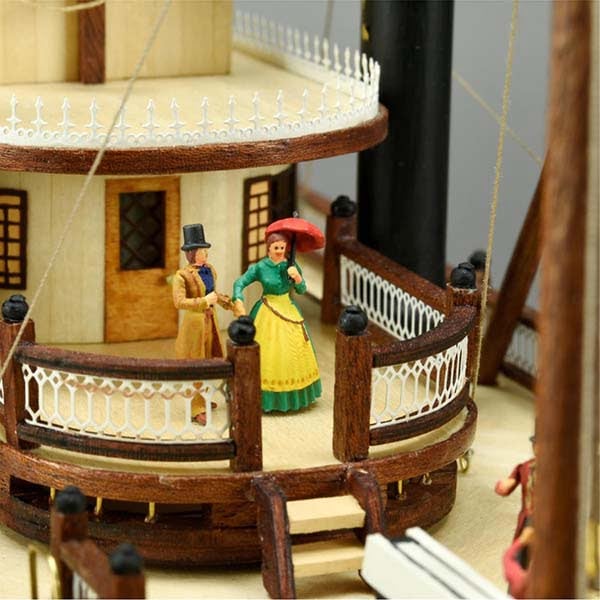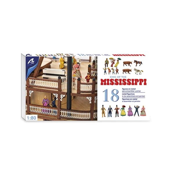 History of the paddle steamers: know the characters: Assemble the set of 18 figurines of characters and animals in metal for the wooden model of the North American ship King of the Mississippi, a world-renowned paddle steamer ship or steamboat that moved thanks to the paddle wheel located at the stern.