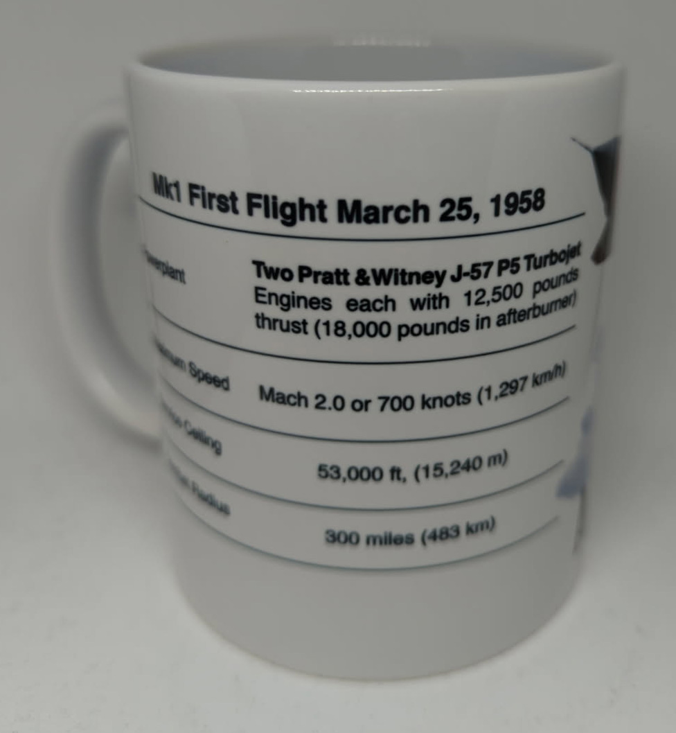 Avro Arrow CF-105 Mk1 First Flight Coffee Mug White with Specs 11oz SUP-MUGAVRSPEFF