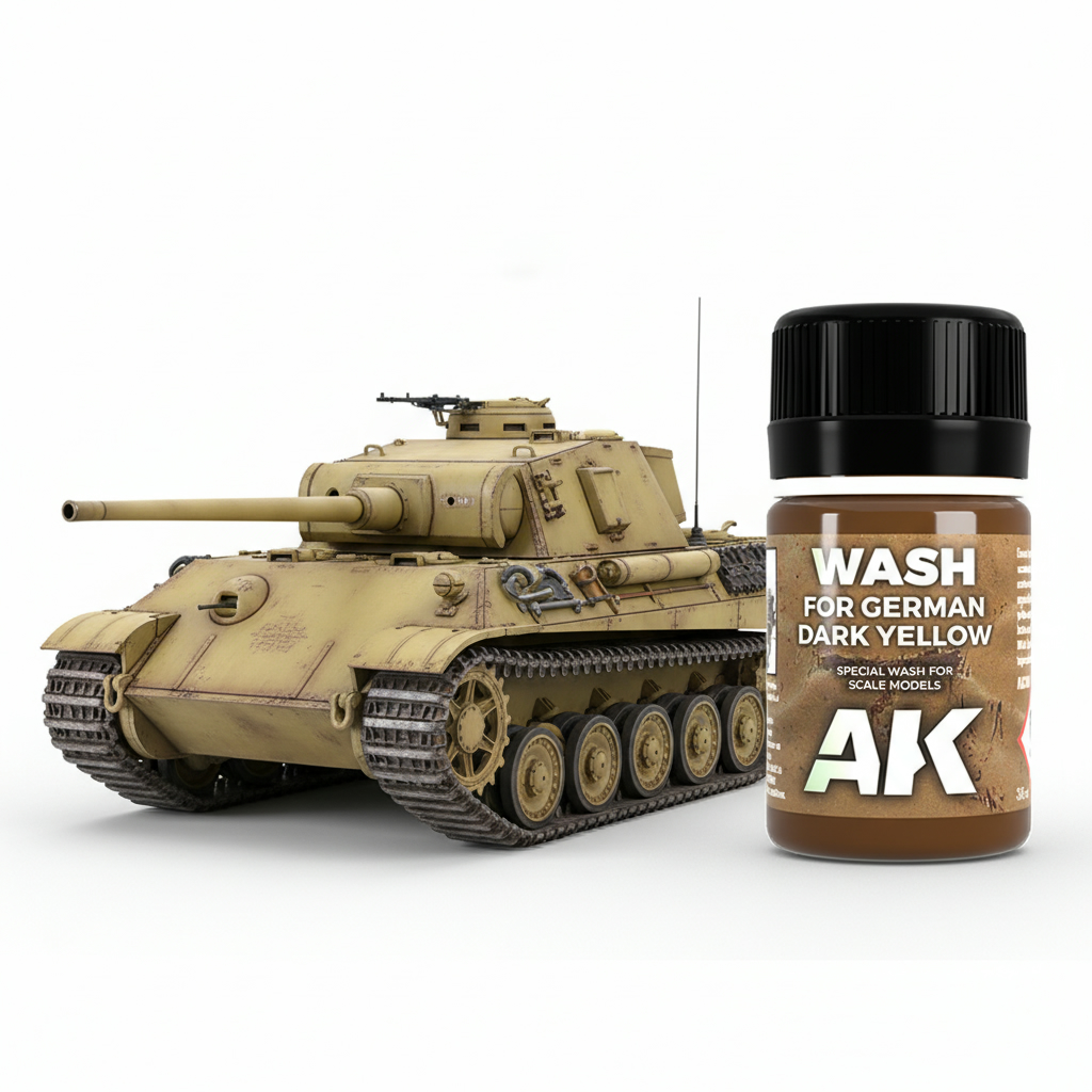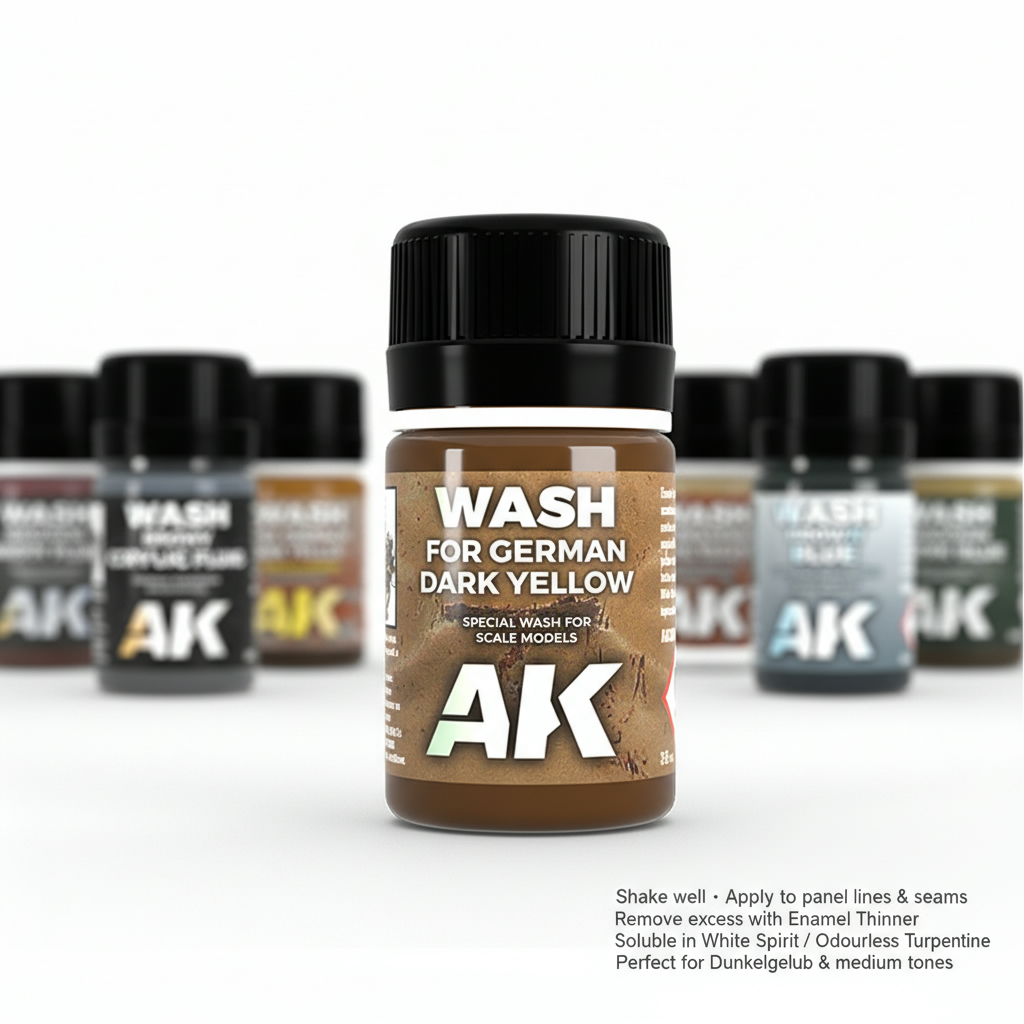 A wash specially designed for German Dark Yellow (Dunkelgelb), but also great for vehicles in medium tones. Just shake well before use and you can apply it directly to your model to create contrast and depth in the details. Remove excess with a clean brush moist in Enamel Thinner. This is an enamel product and can by dissolved using our White Spirit or Odourless Turpentine.