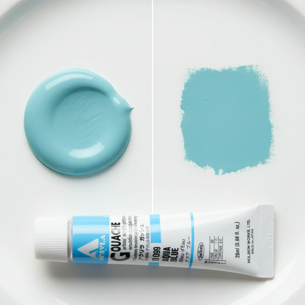 Drying to a velvet matte finish; Holbein Acryla Gouache does not shift in color tone from liquid to dry color. What you see wet is what you get once dry.