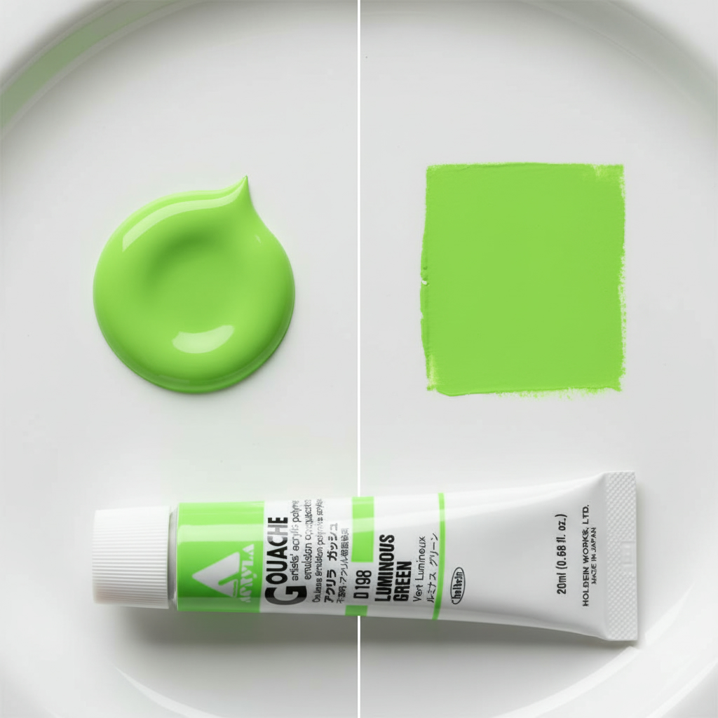 Drying to a velvet matte finish; Holbein Acryla Gouache does not shift in color tone from liquid to dry color. What you see wet is what you get once dry.