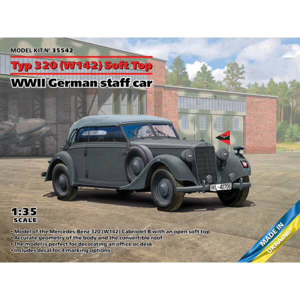 The Mercedes-Benz 320, also known as the W142, was developed at the design bureau of Daimler-Benz AG and began production in 1937. It had a six-cylinder engine with a volume of 3.2 liters (3.4 liters in later versions) and 78 horsepower. The model was available with a short (2880 mm) or long (3300 mm) wheelbase and various body styles. The Cabriolet body variant was available in a long wheelbase version. The four-seater version had two doors and four side windows; the roof was soft and could be folded down to protect it from the weather. This vehicle was often seen in the Wehrmacht, with some retaining civilian license plates. It was used as a staff car and was also used to transport senior commanders.