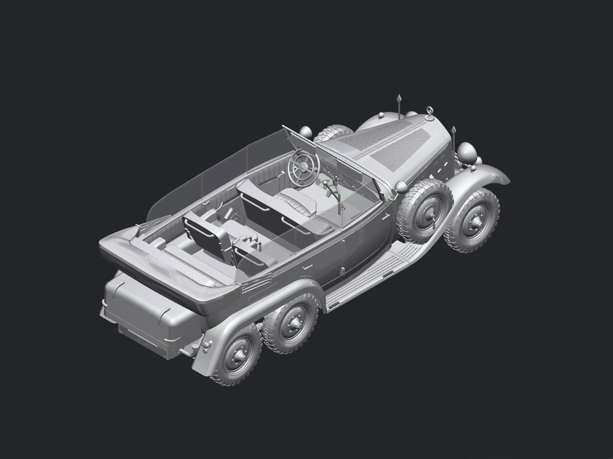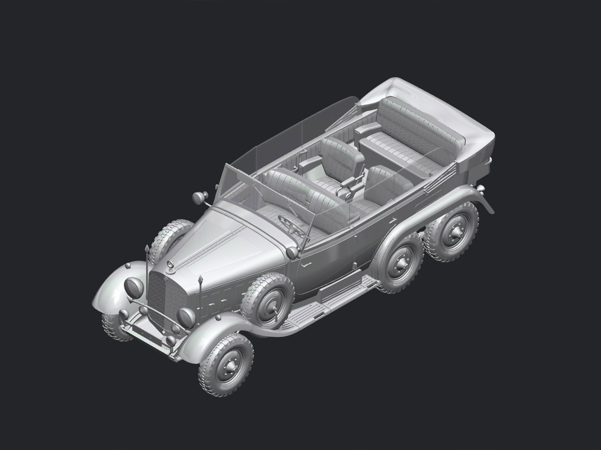 The three-axle off-road passenger car G4 (W31) was designed by Daimler-Benz in 1934. This car had 8-cylinder engine of 100 (later 110) hp and 6 passenger seats. The car was intended for the German army but it appeared very expansive and too complicated for the mass production. There were produced only 72 G4 cars up to the 1939. They were used mainly by the highest state and military authorities of Germany.