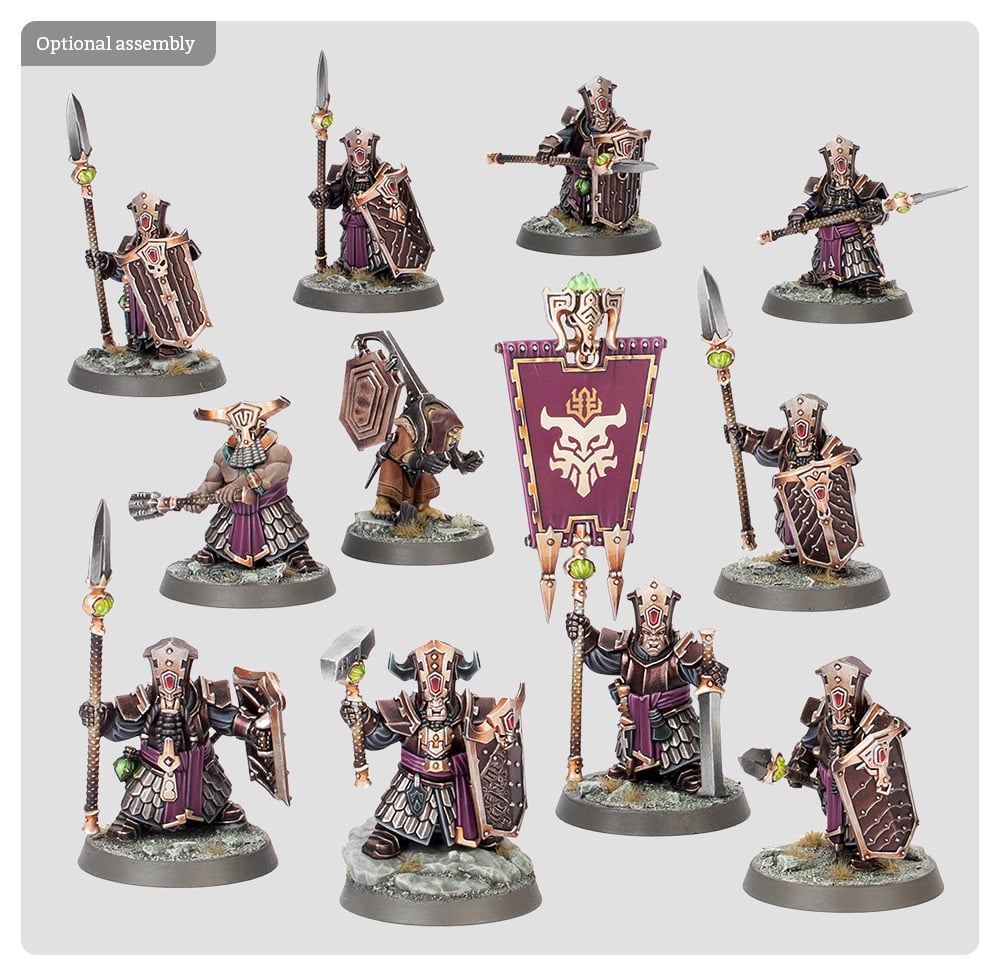 The kit provides parts to build an optional champion with two distinct head choices, armed with either a devastating two-handed axe for maximum offensive output or a hammer and shield combination for balanced attack and defense. The optional standard bearer offers three different head options and three unique banner toppers, allowing you to create a truly personalized icon bearer whose appearance reflects your army’s specific ziggurat allegiance or personal heraldry. The optional musician comes accompanied by his own Hobgrot assistant who has two head choices, adding further variety to your unit’s appearance.