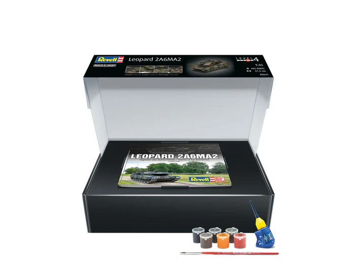 The Leopard 2 A6A2 model kit not only offers an outstanding level of detail, but also becomes an all-round carefree package by the supplied accessories. With the high-quality Revell colors and the specially coordinated glue, you can get started immediately. The multilingual, illustrated building manual leads you through the process step by step, while the precise production of the parts ensures fit and a high -quality result. The enclosed decal images in particular ensure the perfect optical completion of your model.