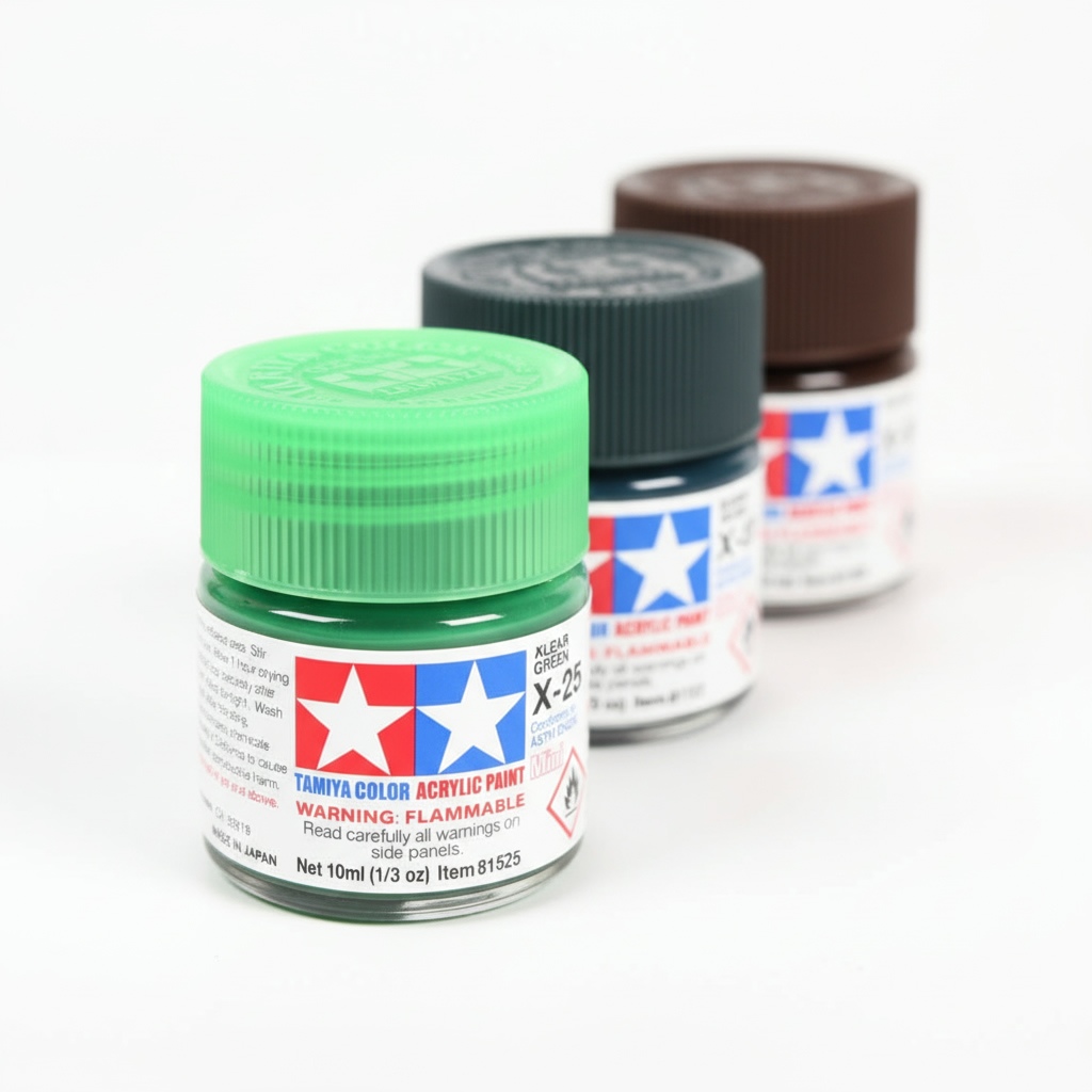 Tamiya acrylic paints are made from water-soluble acrylic resins and are excellent for either brush painting or airbrushing. These paints can be used on styrene resins, Styrofoam, wood, plus all the common model plastics. The paint covers well, flows smoothly, and can be blended easily. Prior to curing, paint can be washed away with plain water.