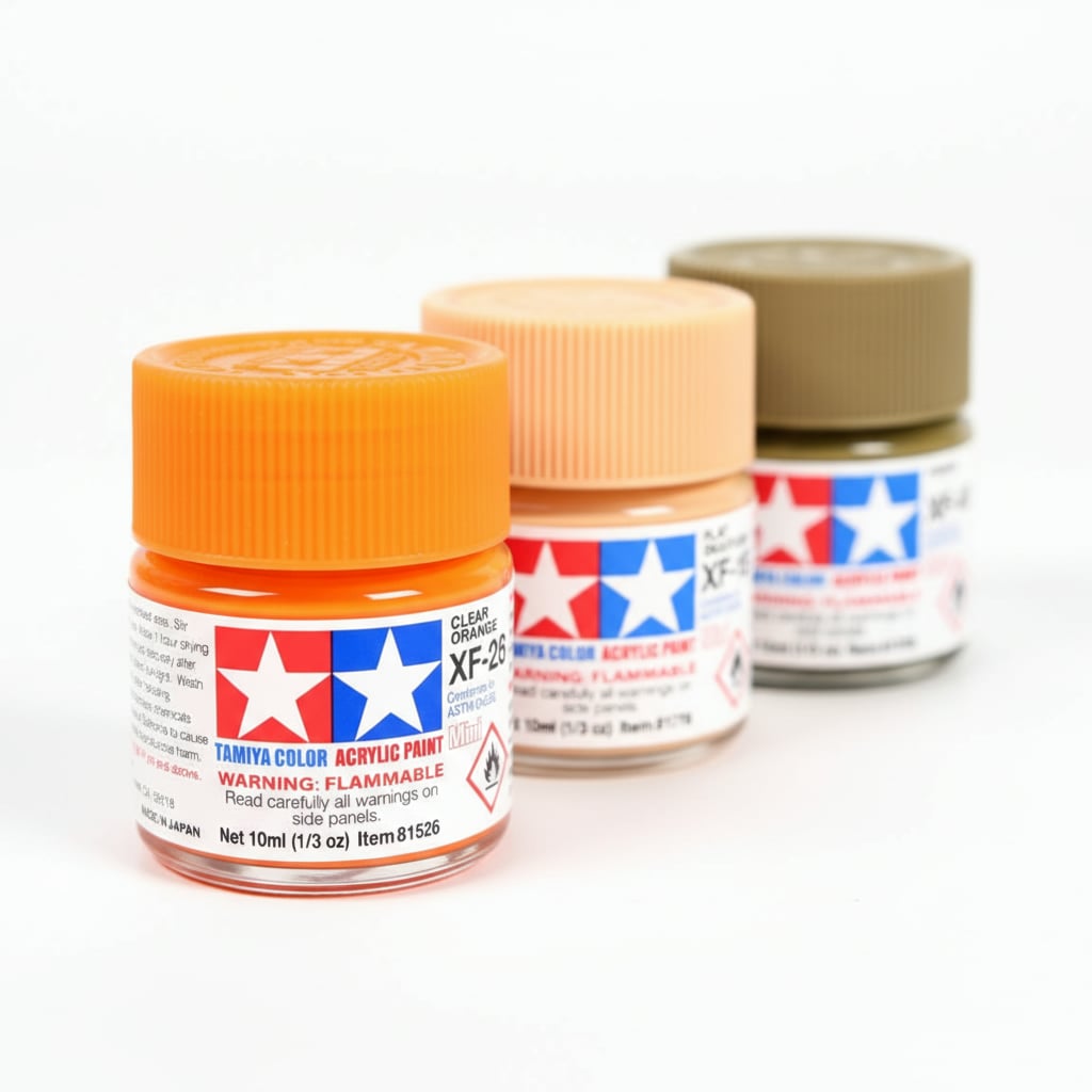 Tamiya acrylic paints are made from water-soluble acrylic resins and are excellent for either brush painting or airbrushing. These paints can be used on styrene resins, Styrofoam, wood, plus all the common model plastics. The paint covers well, flows smoothly, and can be blended easily. Prior to curing, paint can be washed away with plain water.