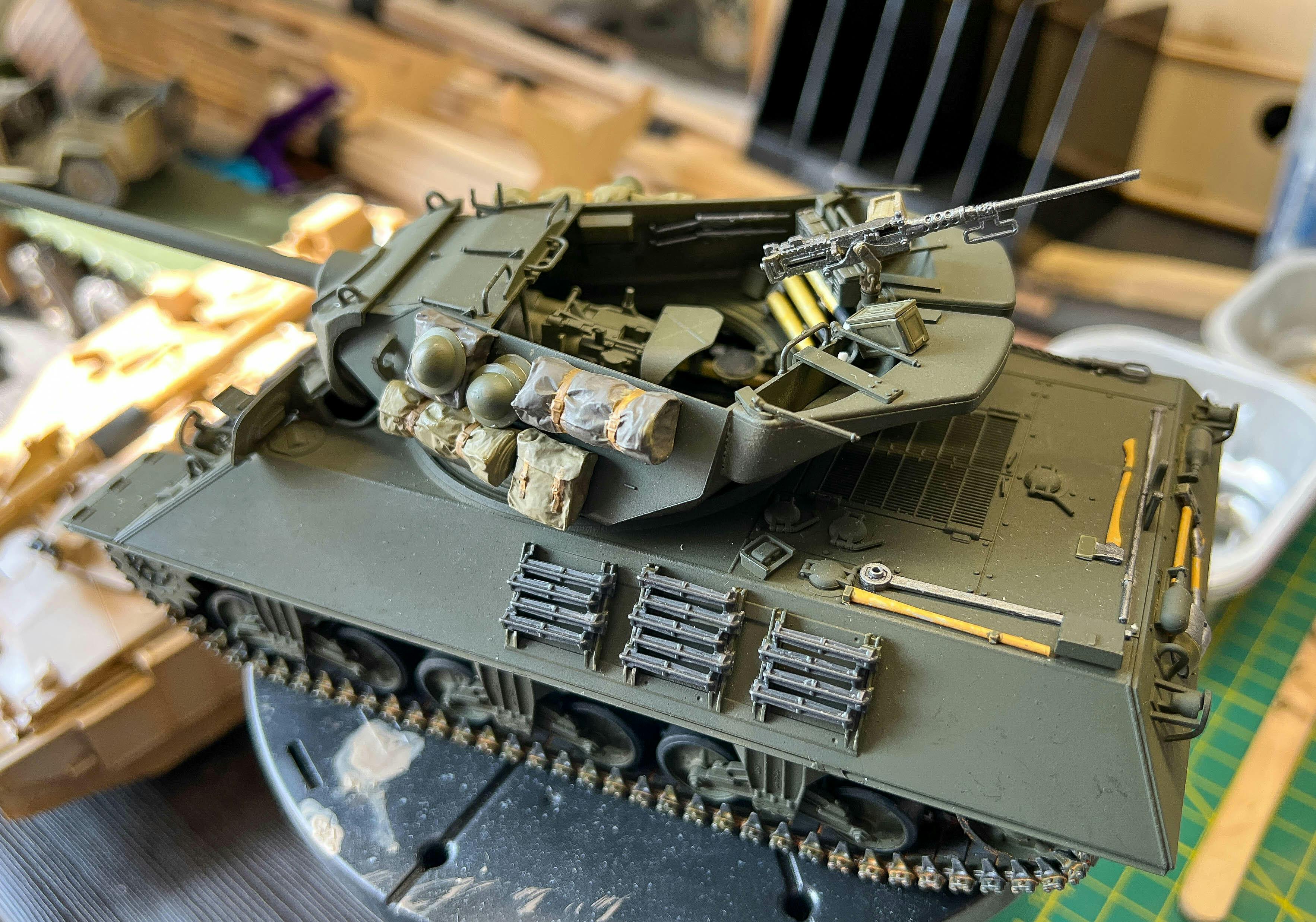 This is a Tamiya model replica of the British Achilles tank destroyer. The Achilles was a modification of the M10s which Britain received from the U.S., with the original 3-inch main gun replaced by the fearsome British 17 pounder. The vast majority of M10s were the M10 IIC variant, which was based upon the late-production M10 with distinctive enlarged turret-rear counterweight. Around 1,000 were produced between Spring 1944 and the end of WWII, the Allied forces making good use of it after the Normandy landings, benefiting from the power of the gun which allowed it to tear through Tiger I front armor.