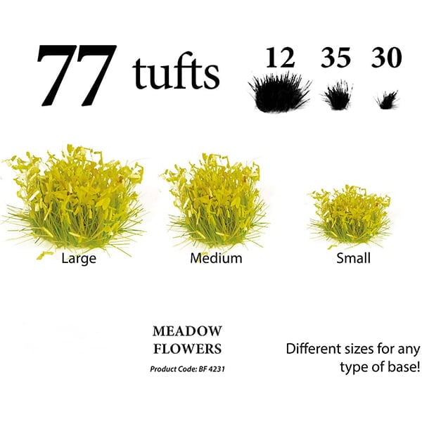 - A PACKAGE OF PLENTY – You get 77 tufts in this package. 12 large tufts, 35 medium tufts, and 30 small tufts allowing plenty variety for your basing and scenery needs.