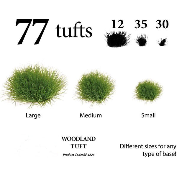 - A PACKAGE OF PLENTY – You get 77 tufts in this package. 12 large tufts, 35 medium tufts, and 30 small tufts allowing plenty variety for your basing and scenery needs.