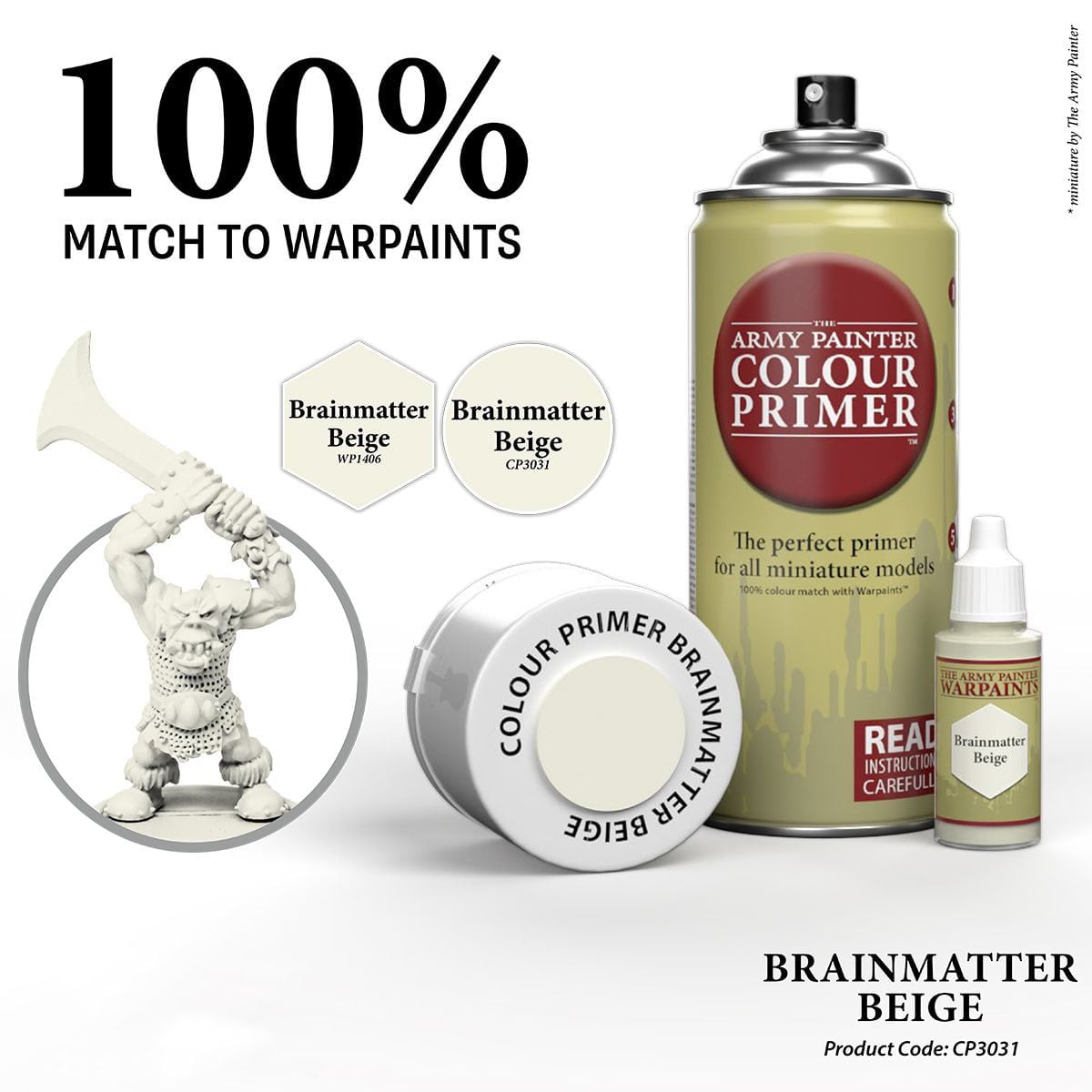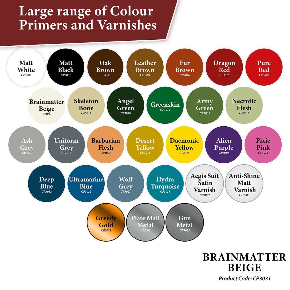 Like it’s matching Warpaint, this Colour primer is a warm white tone. Brainmatter Beige is a recommended basecoat for vampire skin, ghoulish miniatures, and works beautifully as a base layer for all of your Speedpaints!