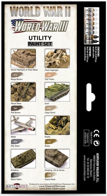 The Utility Paint Set combined with the appropriate nation specific paint set, contains all the colors needed for painting WWII and WWIII miniatures. Alternatively, this set offers complementary colors for guns, flesh, wood, and washes for shading effects over figures and vehicles.