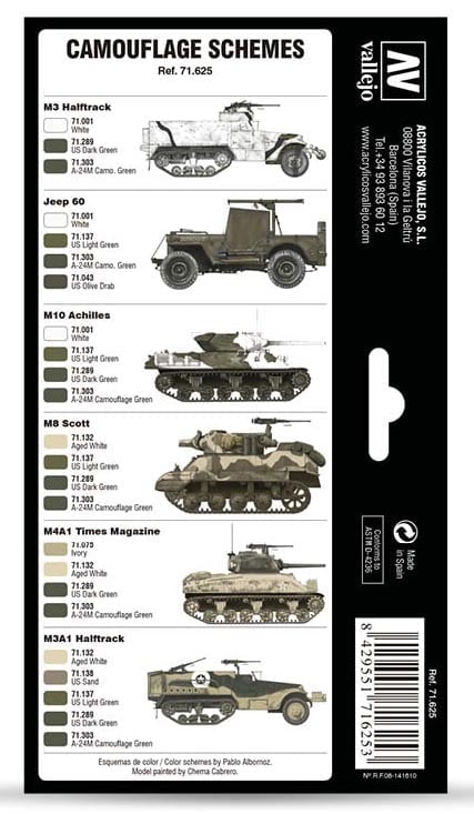 The set includes all the tones used as base colors as well as those used to create the different camouflage schemes used in Europe (ETO), winter pattern camo and the schemes used by operating vehicles in North Africa.