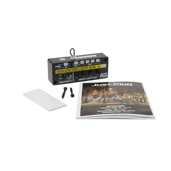 Bring your layout to life with a Sequencing Light Hub. Add up to four Just Plug lights that individually sequence on and off. Includes dimmer and speed controls. Turn sequencing off to use as a Light Hub. Add an optional Auxiliary Switch for convenient operation.