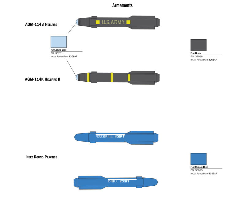 The AH-64 Apache can be considered the most famous attack helicopter in history. It was designed to operate on the front line and to perform anti-tank, anti-helicopter, assault and close support missions in “all weather” conditions and in any operating environments. The AH-64D Longbow is the upgraded version with and increased offensive capability and the adoption of advanced target acquisition systems. The “Longbow” is characterized by the AN/APG-78 radar, housed in the radome located above the main rotor. It raised position enables target detection and use of missiles, as the anti-tank Hellfire, while the helicopter is hidden behind hills, trees or buildings and out of enemy sight. The main armament is the 30 mm M230 Chain Gun installed under the cabin. The AH-64D is able to load, in its four pylons on the stub wings, a significant variety of offensive weapons as rockets and missiles.