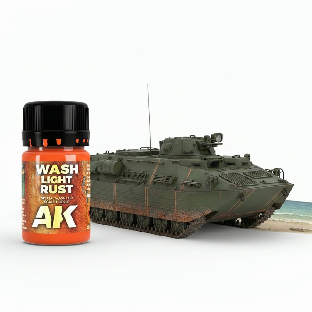 Light rust wash is indicated for rust effects on all kind of surfaces. Perfect for any rust effects on vehicles or accessories. It has a light rusty color, which stands out really well on dark greens giving a great realistic matt finish. It is perfect for amphibious or normal vehicles in wet environments. Also great for doing rusting effects on abandoned vehicles. The basic technique used to weather any type of model is the wash, a classic technique that is still one of the most used techniques in modelling today. Apply the washes after shaking the bottle with a large brush to pick out details and creating shadows.