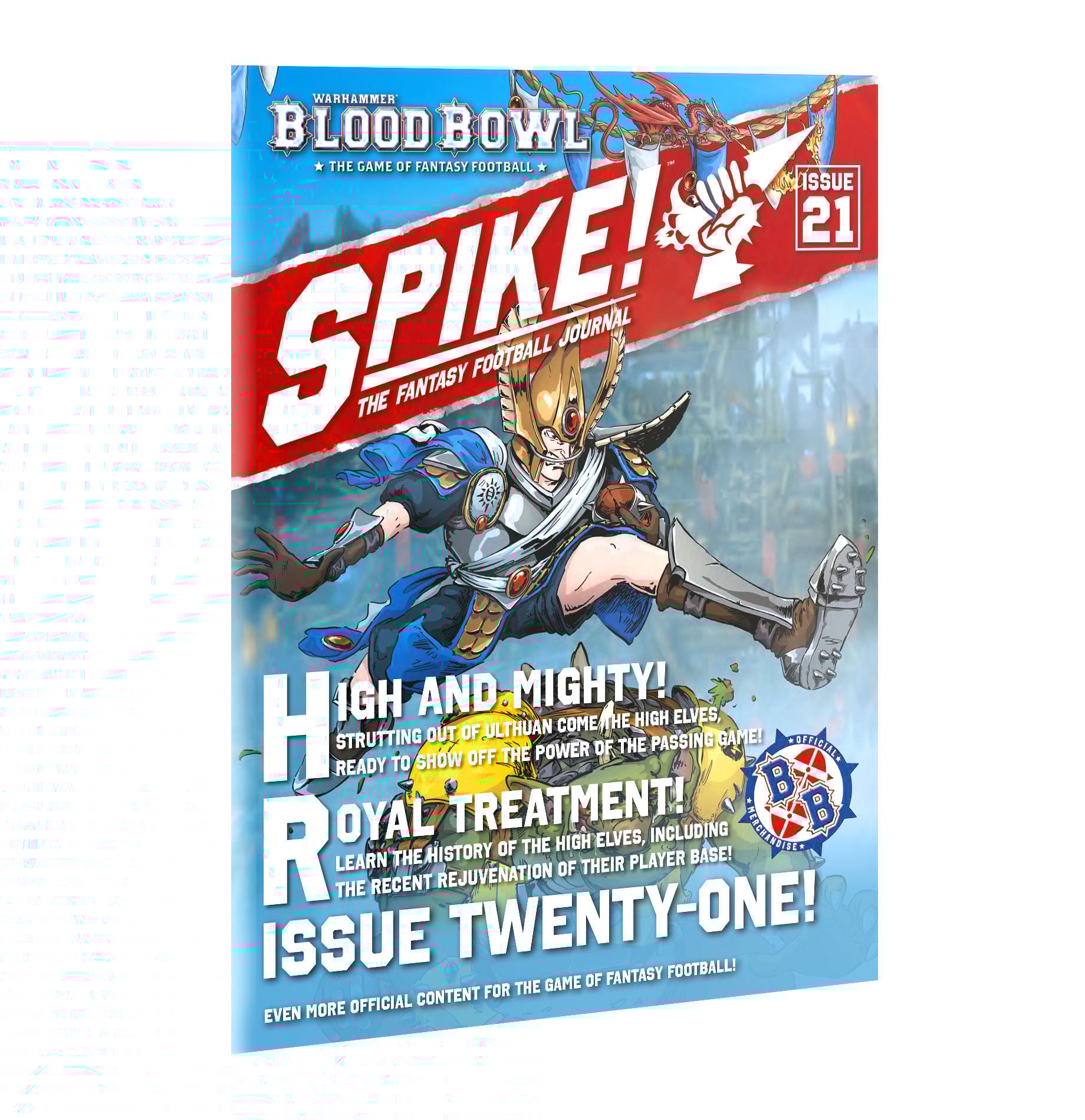 Guest editor Alandrian the Exiled, Ex-Prince of Caledor, takes us on a journey to Ulthuan in this Spike! Journal, with an emphasis on the Caledor Dragons – the new High Elf Blood Bowl team. This exciting issue will help you get the most out of your team, and includes rules for themed pitches and balls, the Spectacle of the Flame Eternal, coaching tips, and entertaining editorials.