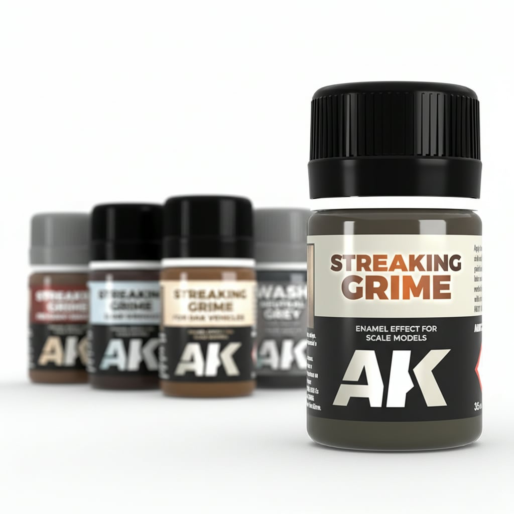 Enamel type streaking for modelling. Create realistic dirt streaks and grime effects easily with this dirty color. This enamel product creates realistic streaking grime effects on your models. Easy to apply. Very realistic coloristic color. Shake well before use. Apply your streak with a fine pointed brush in irregular vertical lines from upper parts on sides and let the paint dry for about 10 minutes.