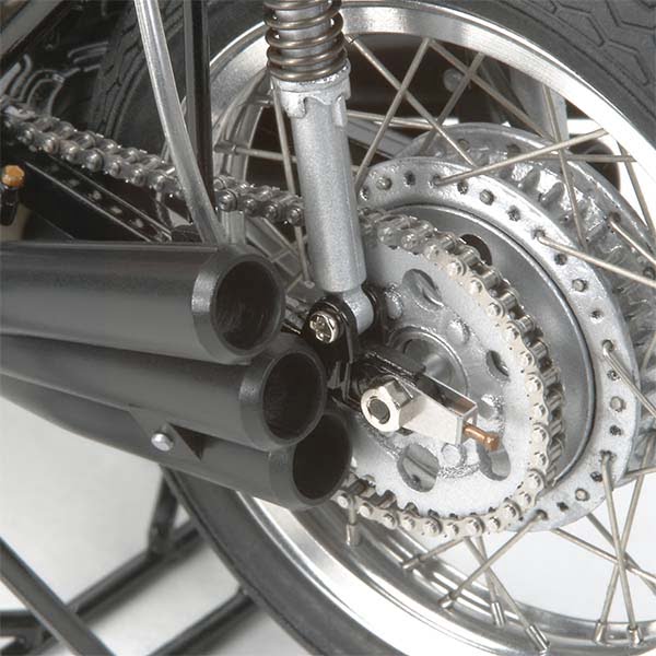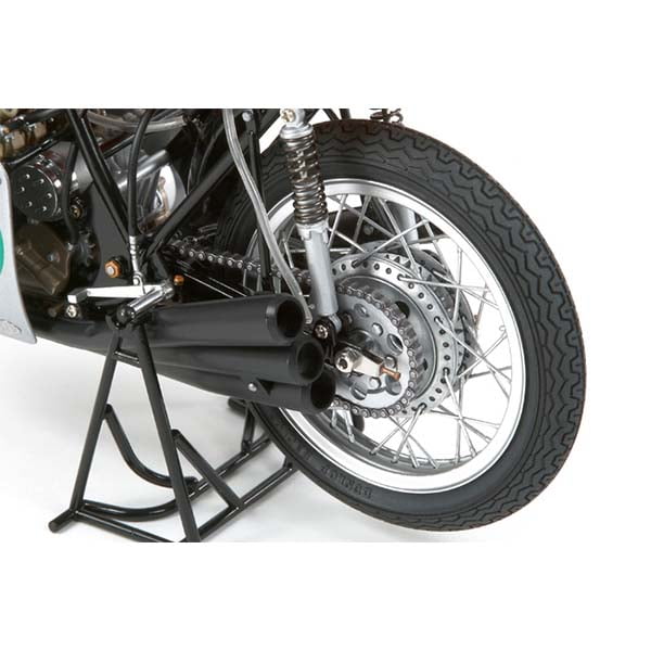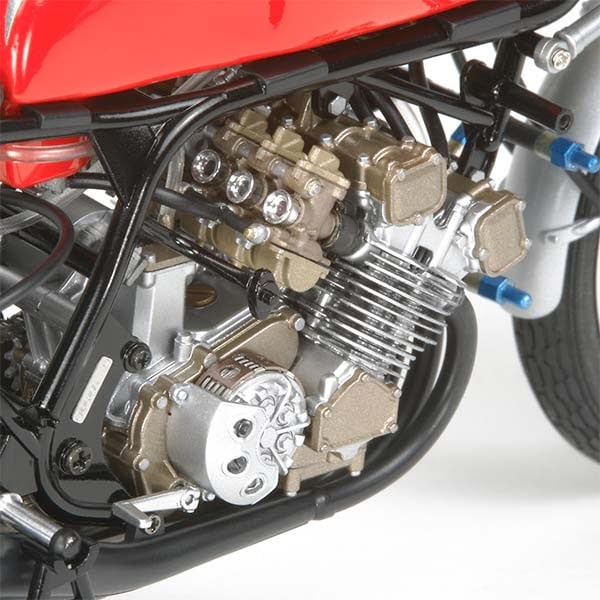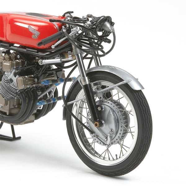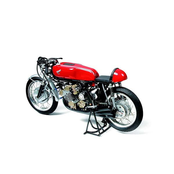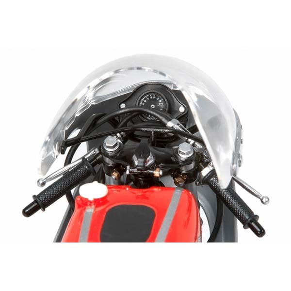 The Honda RC166 is known for its excellent top speeds and features a 6-cylinder engine with six exhaust pipes. The bike was made famous by motor sports legend Mike “The Bike” Hailwood, who raced the RC166 to 10 victories and a world championship title. His infamous bike is reproduced as a model and features red and silver FRP cowling, large diameter drum brakes and silver spoke wheels.