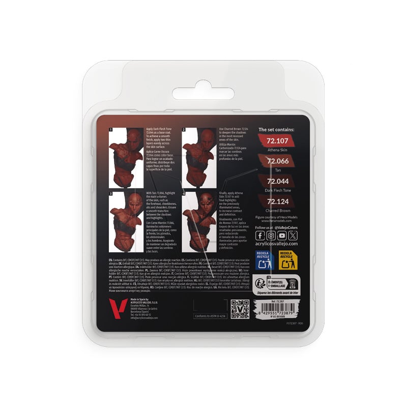 A selection of colors ideal for painting tan and dark skin tones with naturalness and depth, allowing you to build volume and nuances in both realistic and fantastical figures. The set includes a base color, a shadow color, and two highlight colors.