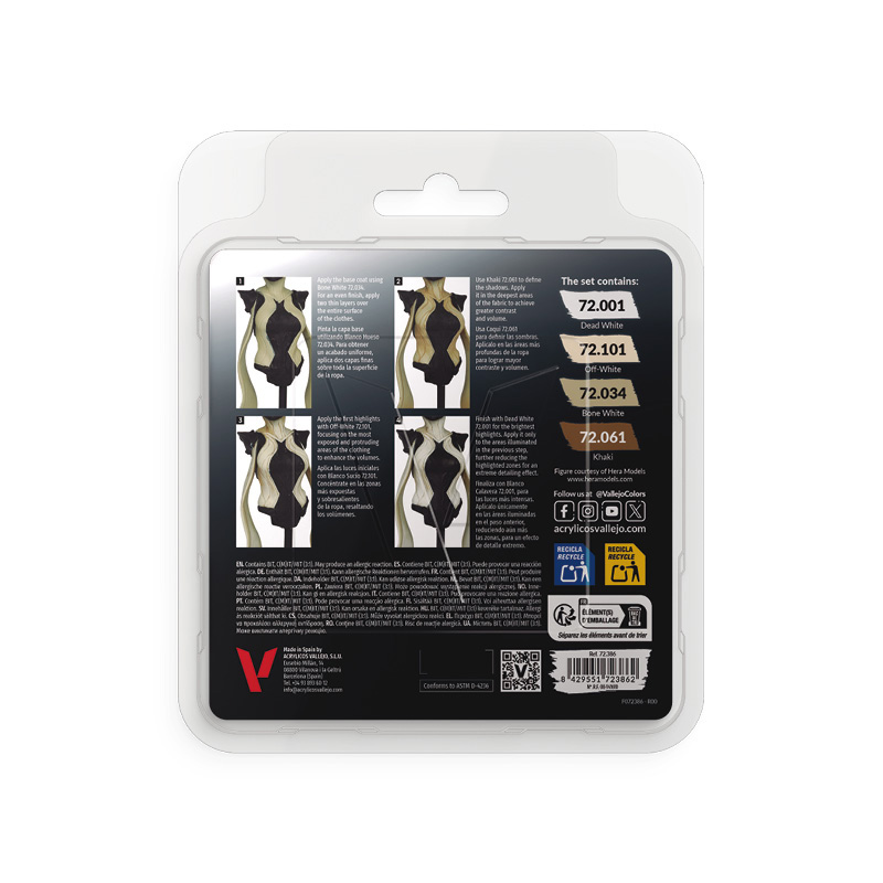 Painting elements in white is always a challenge. With this selection of shades, you’ll achieve spectacular, vibrant whites, where controlling the contrast is key. The set includes a base color, a shadow color, and two highlight shades.