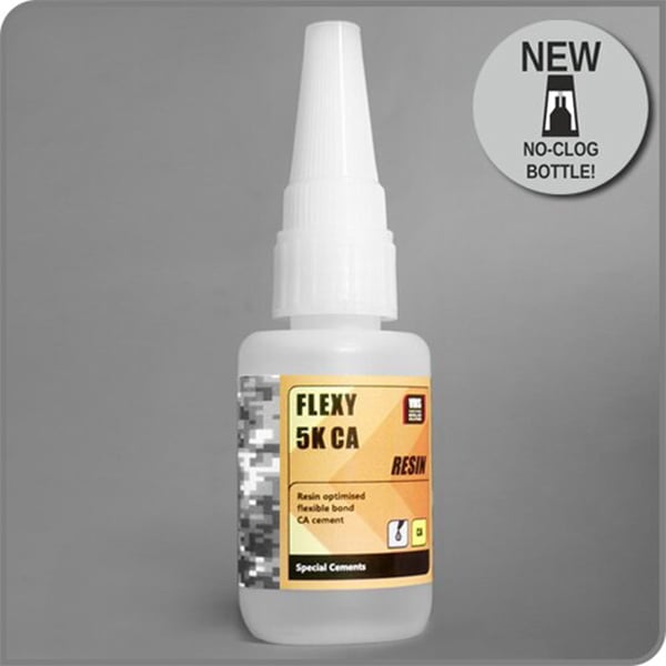 This is a resin dedicated version widely acclaimed Flexy 5K. Thanks to its formulation this glue can be used for gluing demanding resin parts that require a lot of manipulation and extra strong bond. As the original Flexy 5K glue forms flexible bond that withstands much more punishment than classic brittle CA. This essentially means less accidentally lost parts and more productive and enjoyable work as there is much less need to reglue vulnerable parts. Extended open time (125% the standard CA) allows for good positioning of the parts. You also will be able to glue tricky parts that produce tension. For best results prepare parts with VMS Styrene Cement (standard type) prior application of the actual CA glue.