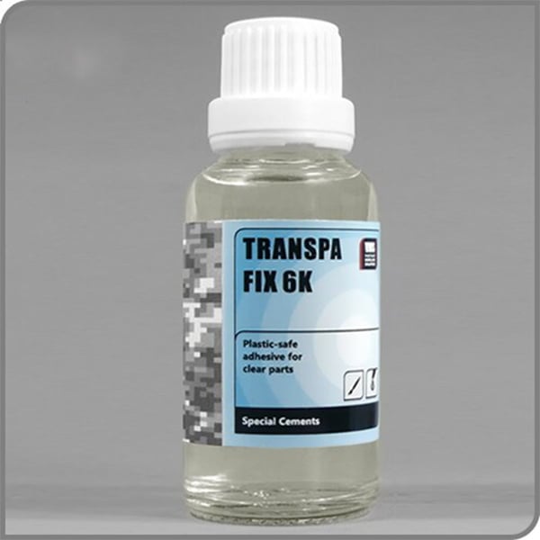 Clear parts require special handling, both styrene and CA glue types will damage clear plastic and classic dedicated clear parts adhesives are irreversible making them a hit and miss solution. With VMS Transpa Fix 6K you will have all the time in the world to position the parts and excessive adhesive is easily removed producing a stunning result! IMPORTANT: The recommended glue thinner for Transpa Fix 6K is VMS Universal weathering carrier light type, which will not damage clear parts!